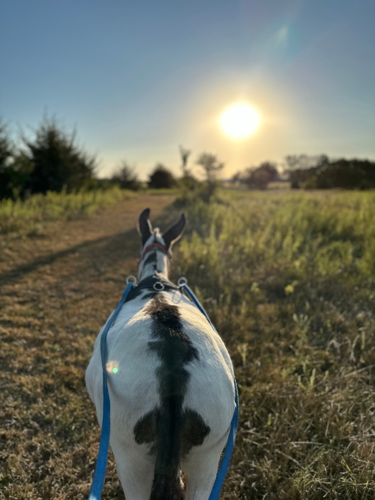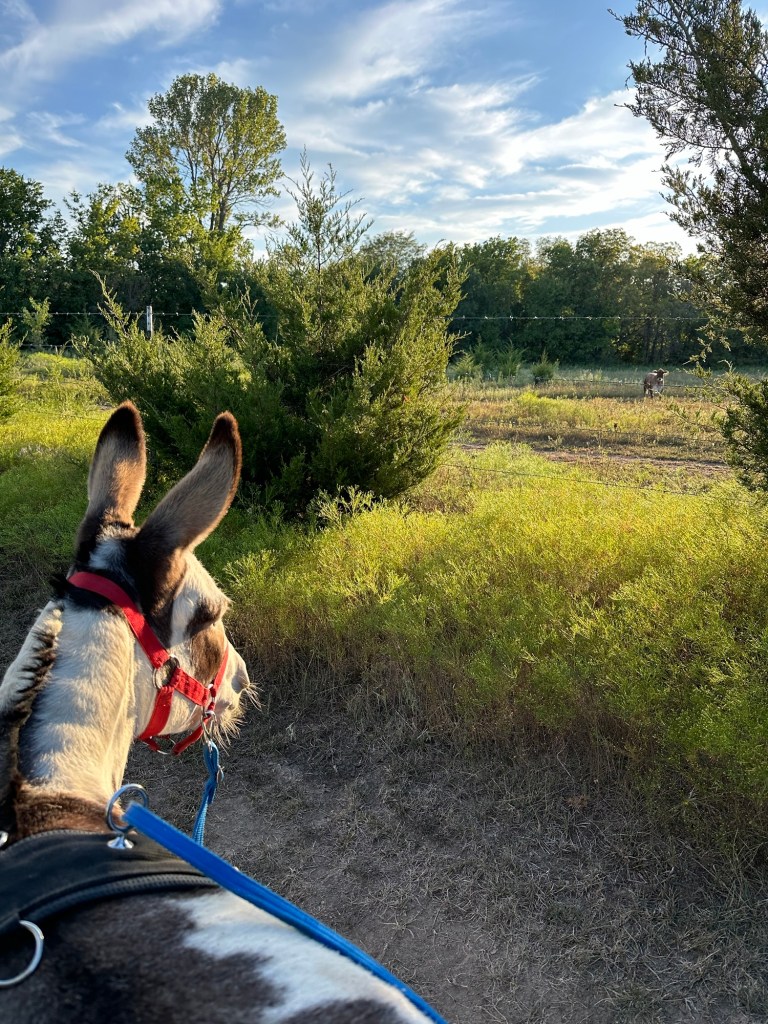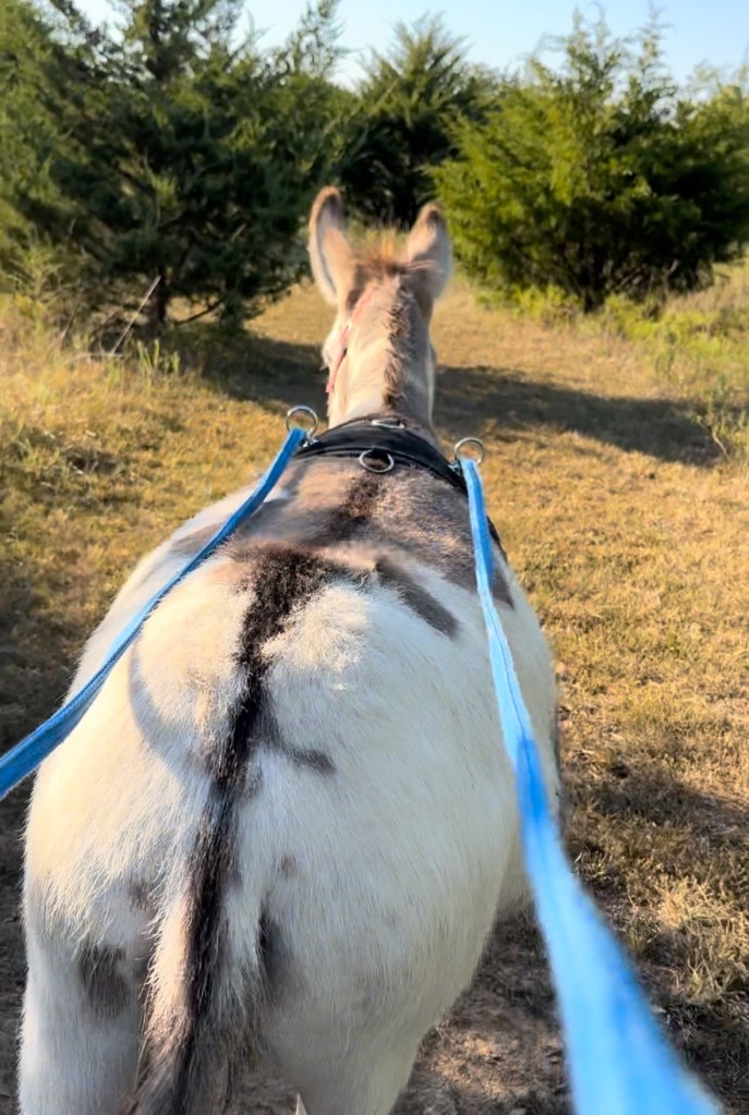 Personally, I enjoy making trails on my property to explore. It’s also a good way to see how your donkey responds to deer and wildlife you may encounter before they are hitched to a cart. We practice reining, trotting, backing and sometimes working through obstacles.
