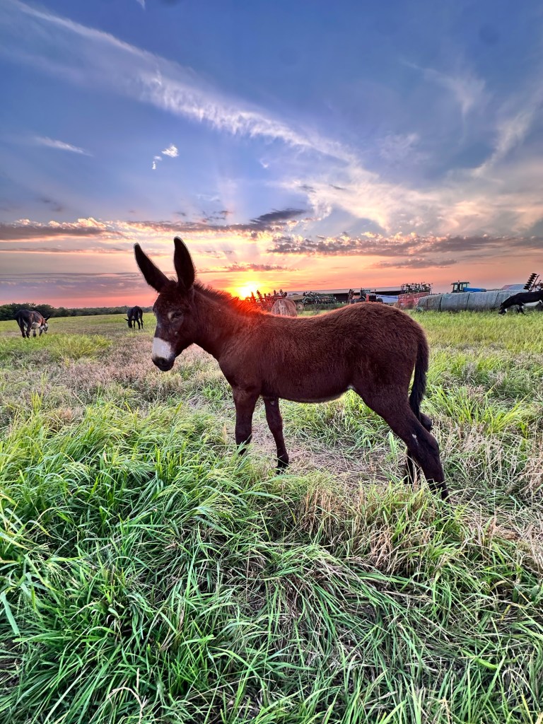 Mammoth donkeys are sweet, gentle creatures. They love attention and will stand for hours to be groomed. What a relaxing and satisfying way to end a day, in their quiet presence, watching a glorious sunset.